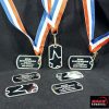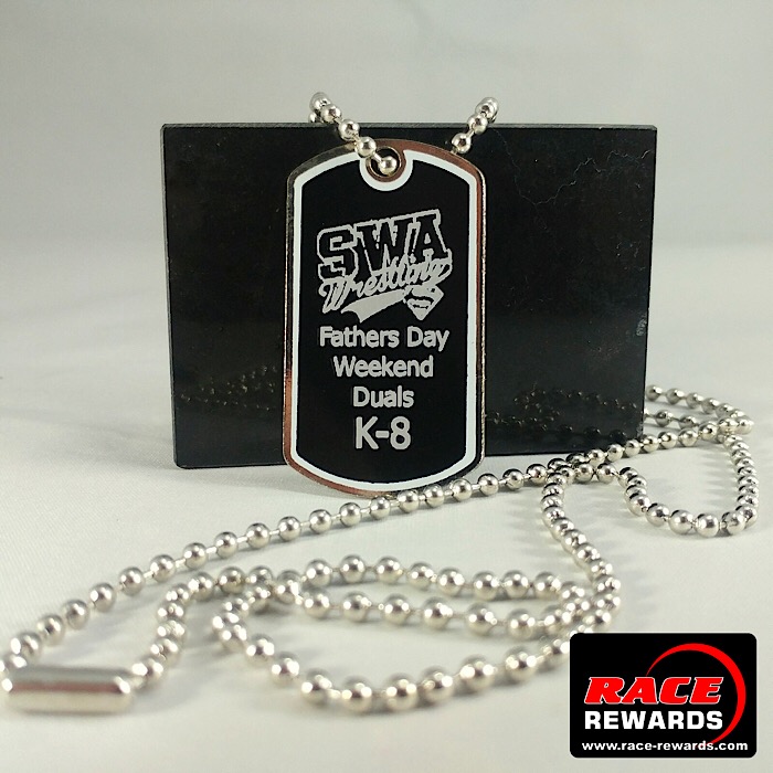 These high-quality dog tag medals come by sport and a blank option as well. Laser engraving on the front side & back side is available with any information, variable text with logos and/or graphics. For attachments, you have a choose of colored ribbon or medal neck chain in gold or silver. Check gallery tab for pictures.
